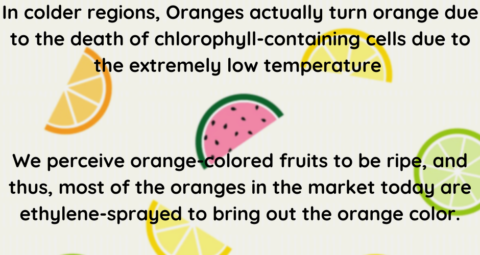 We generally perceive orange color with ripe fruits, and from a sales point of view, it helps in business if ripe oranges are of a bright orange color. To solve this problem farmers spray their crops with Ethylene, to kill off any remaining chlorophyll. Doing this is for appearance and has no effect on taste.